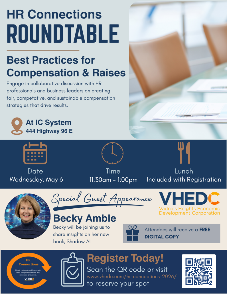 HR Connections is a professional development resource group for local HR practitioners and business leaders to network and discuss topics and trends involving workforce development and employment related issues. Sponsored by the Vadnais Heights Economic Development Corporation (VHEDC), HR Connections has been meeting since 2016, building strong professional connections in the Northeast Metro area.