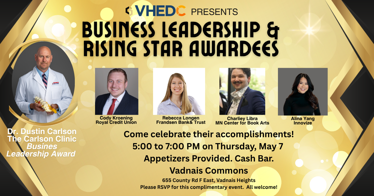 Come and celebrate our Rising Stars and Business Leadership award winners at this free event at The Vadnais Commons. 5-7pm Thursday, May 7, 2026. Each year we recognize outstanding individuals in our business community. This Business Appreciation event will have appetizers and a cash bar. Please RSVP.